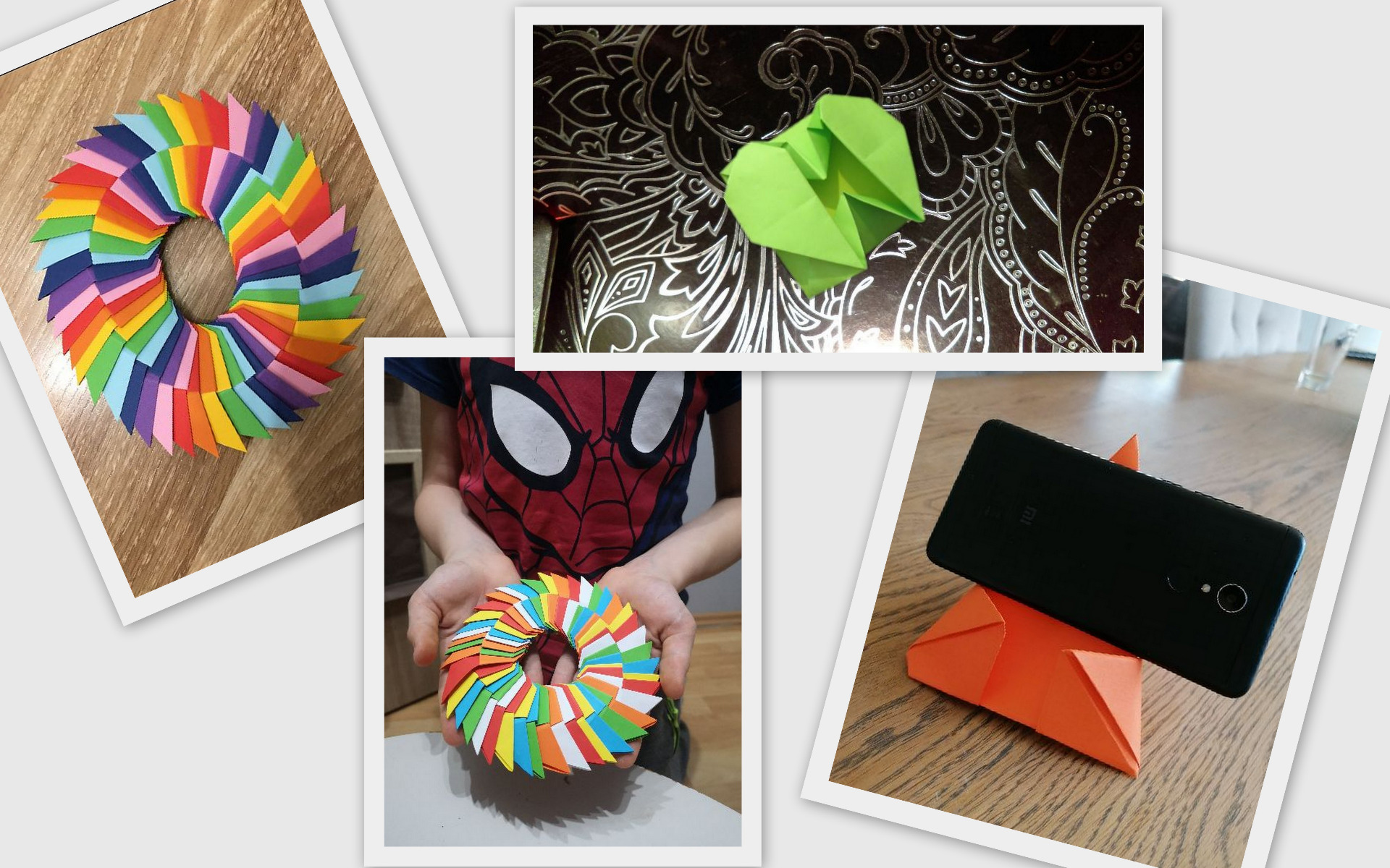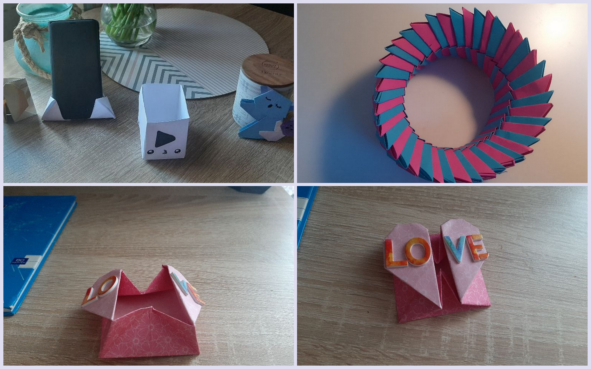 Przedmioty użytkowe z papieru ( zabawki antystresowe, pudełka, podstawki pod smartfona, koperty serca), wykonane techniką origami przez uczniów klas 6a, 7b i 7c.
